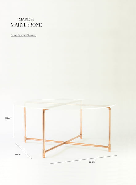 Product Details • Dimensions: W: 53 cm D: 53 cm H: 33 cm • Acrylic or Glass Top: W: 80 cm D: 80 cm H: 6mm • Weight: 4 kg • Style: industrial decor • Materials: copper frame, clear or bronze mirror acrylic top • Finish: copper frame polished to obtain a shiny rose gold finish |