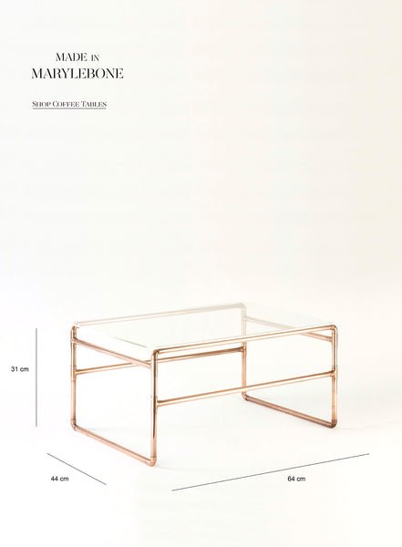 Product Details • Dimensions: W: 64 cm D: 44 cm H: 31 cm • Surface Top: W: 64 cm D: 44 cm H: 6mm • Weight: 4 kg • Style: industrial decor • Materials: copper frame, clear acrylic or glass top • Finish: copper frame polished to obtain a shiny rose gold finish |