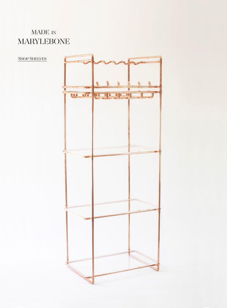 This handmade shelving unit is made with very high attention to detail with modularity in mind. It's eye catching minimalistic look matches well with contemporary interiors and can be used in any living room/dining area. Its frame is made from copper pipe, It has three tiers of acrylic shelves, a unique wine glass and wine bottle rack compartment. Assembly is required.