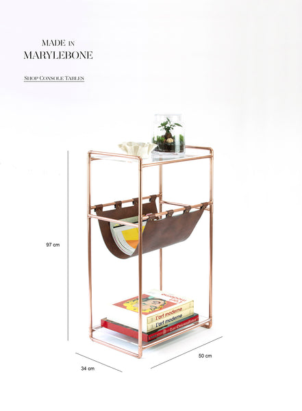 Product Details • Dimensions: W: 50 cm D: 34 cm H: 97 cm • Acrylic shelves: W: 46 cm D: 34 cm H: 6mm • Leather holder: W: 62 cm D: 44 cm H: 6mm • Weight: 7 kg • Number of shelves: two • Materials: copper frame, clear acrylic shelves, distressed brown leather • Finish: copper frame polished to obtain a shiny rose gold finish |