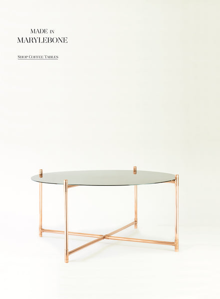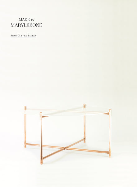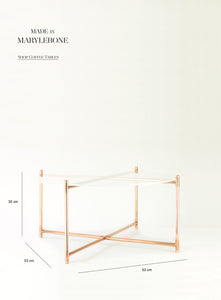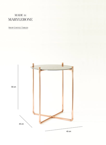 Product Details • Dimensions: Tall W: 45 cm D: 45 cm H: 50 cm, Low W: 53 cm D: 53 cm H: 35 cm • Surface Top: Tall W: 41 cm D: 41 cm H: 6mm, Low W: 51 cm D: 51 cm H: 6mm • Weight: 5 kg • Style: industrial decor • Materials: copper frame, clear or bronze acrylic or glass top • Finish: copper frame polished to obtain a shiny rose gold finish |